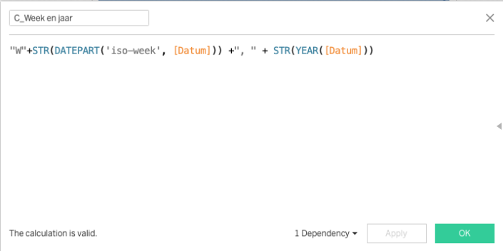 - Columns: [C_Week en jaar] als discrete dimension, sort op ‘Sort by: Field‘ gebaseerd op een datumveld.