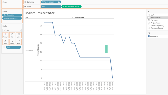 Sleep daarnaast [Rol] op Rows en op Filters, kies voor ‘Show Filter‘ en maak van het filter een ‘Single Value List‘ . Sleep vervolgens [Gewerkte Uren] op Rows en stel het Marks Pane eventueel bij zodat de vorm op Line staat.