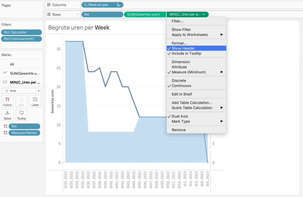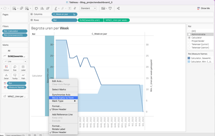 Zet vervolgens de functie van SUM() naar MIN() en maak via het Marks Pane van de lijn een Area. Om de lijn van SUM([Gewerkte uren]) naar voren te krijgen dient met de rechtermuisknop op as gedrukt te worden en Move marks to front geselecteerd te worden.