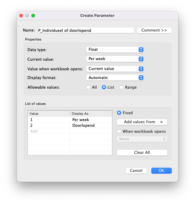 Nu gewerkte uren in maanden en ISO-weken in de calculaties staat kunnen er parameters toegevoegd worden om te schakelen. Het idee is dat er geschakeld kan worden tussen het verschil tussen begroot en geboekt per week en de Running Sum, of het doorlopend verschil. Hier voor moet u eerst een parameter gemaakt worden.