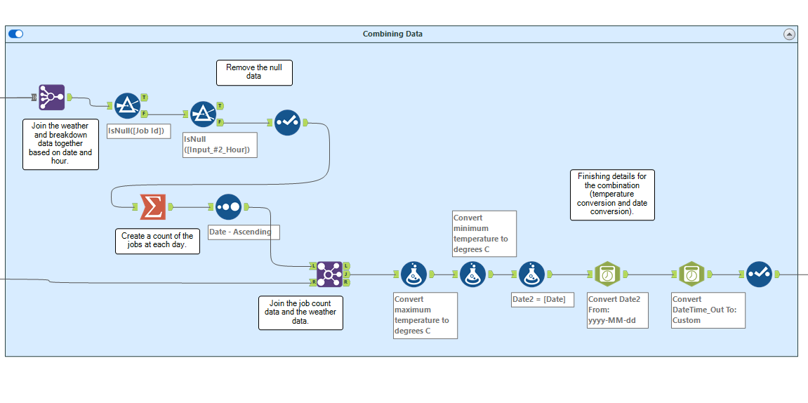 After this, the majority of the cleaning of the data is done. Now, we want to combine the datasets using a join tool. You want to join based on a common field between your independent and dependent variables. If we want to predict the future, we must find correlations from the past. In my example, we are looking at the influence weather has on breakdowns, so they are related by time. Therefore, I joined the datasets together based on the date.