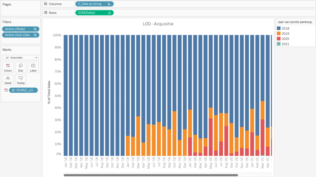 Marks: DATEPART(‘year’, [C_LOD Acquisition Date]) op Colour.