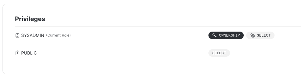 Een eerste stap die ik checkte is welke permissies alle tabellen in Snowflake hadden. Zorg ervoor dat de tabellen die je wilt zien allemaal een rol met tenminste de ‘SELECT’ permissie hebben. Deze rol moet uiteraard ook toegekend zijn aan de Snowflake user account waarmee je Power BI koppelt aan Snowflake.
