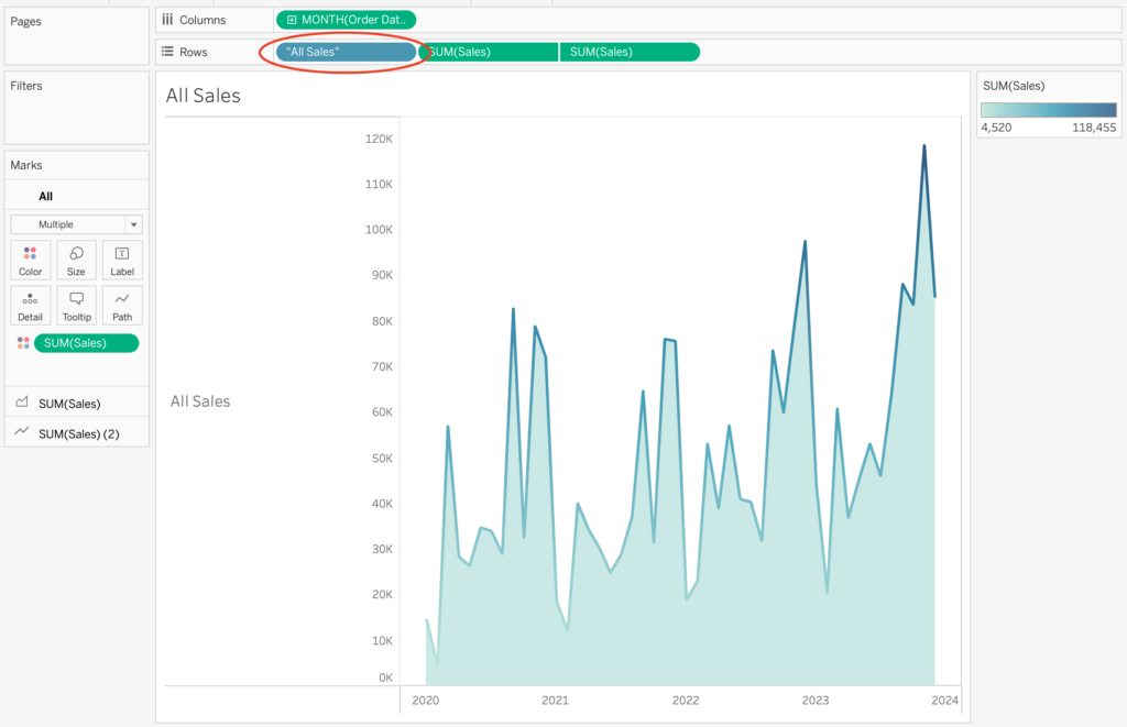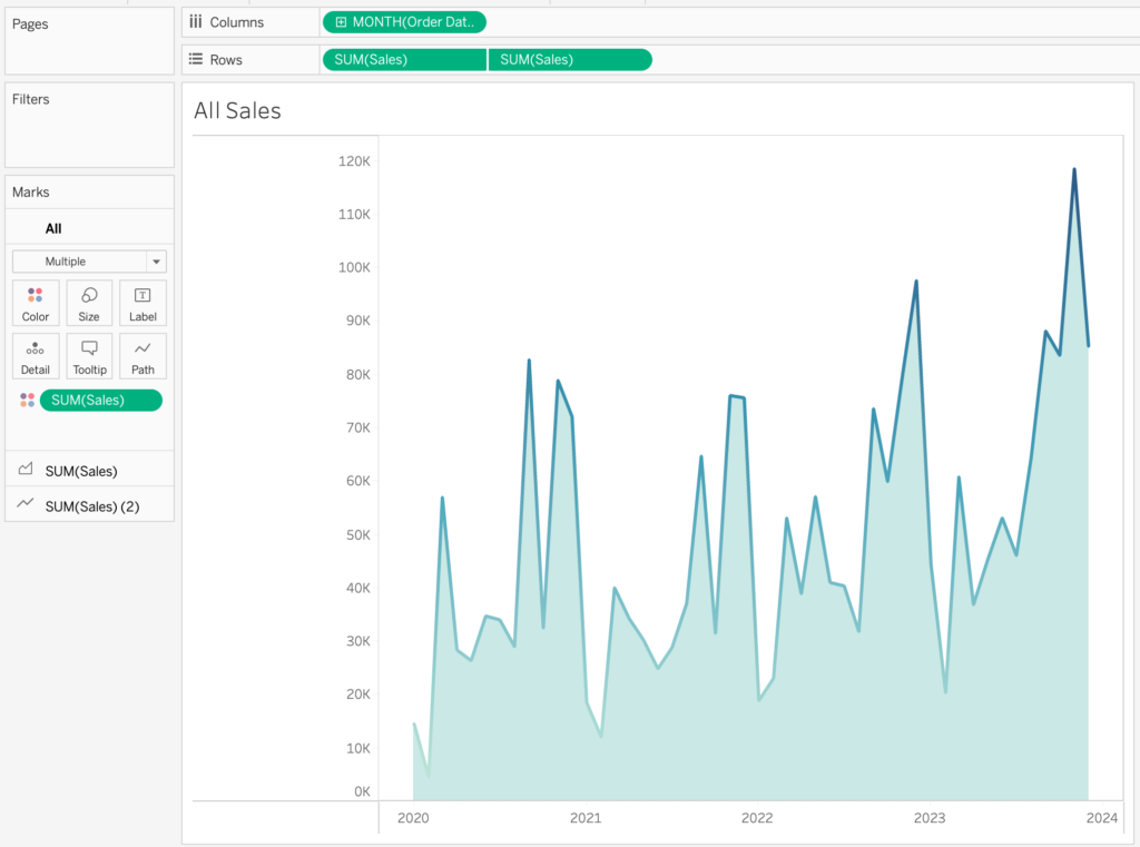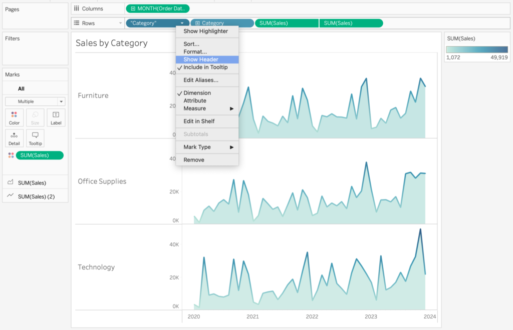 On the top sheet, I am showing SUM(Sales) by month of Order Date. The middle one is the same but also with the [Category] dimension in the Rows. And the one at the bottom is the same as well but for [Segment] instead of [Category]. So first things first is to configure the sheets that you want to use.