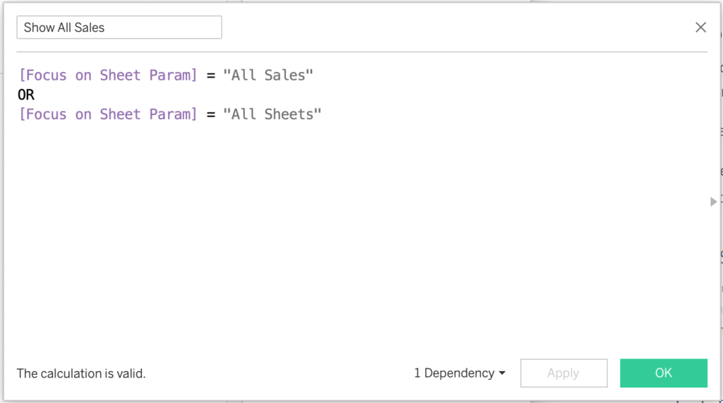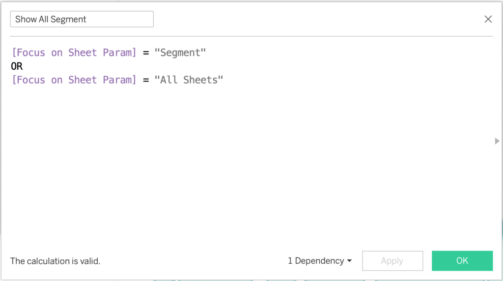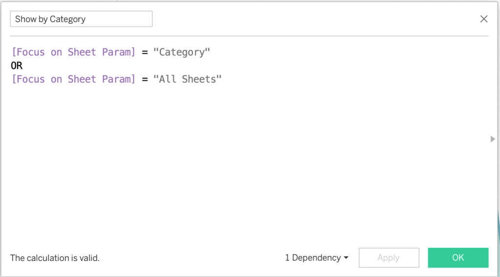 You do not have to place these new calculations anywhere in the sheets, they will be used separately. Since I want to see all as well when no individual selection is made, the “All Sheets” parameter member is also a condition on all the calculations.