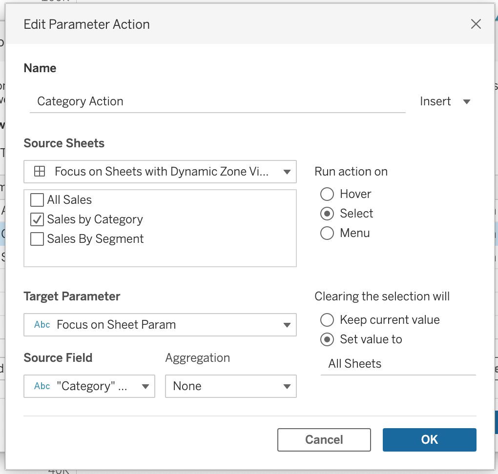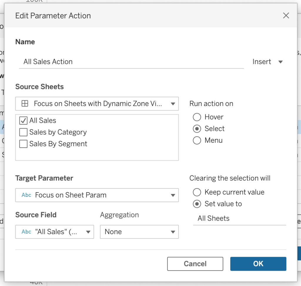 The important thing to pay attention to is for each of the three actions, select one source sheet. Target the parameter we created. Select the custom field we make for each of the sheets as the source field. And when clearing the selection, set the value to “All Sheets”, which makes sure that we see everything again.
