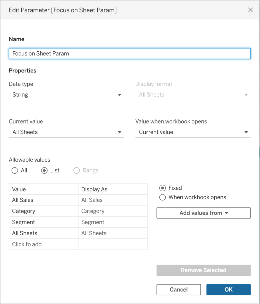 After configuring the sheets, it is time to set up your parameter. I have three sheets, one shows all sales, one with category, and one with segment. I also want to be able to view all at once as well. So my parameter values should represent what I want to see: