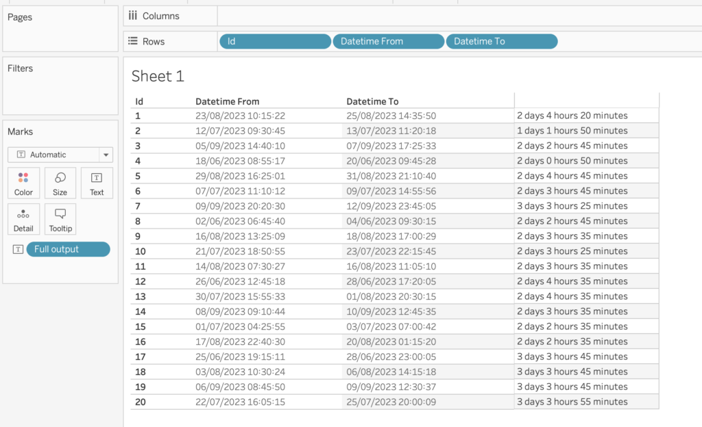 Let’s walk through the process of calculating the accumulated difference between two datetime fields, keeping track of days, hours, and minutes, using Tableau.