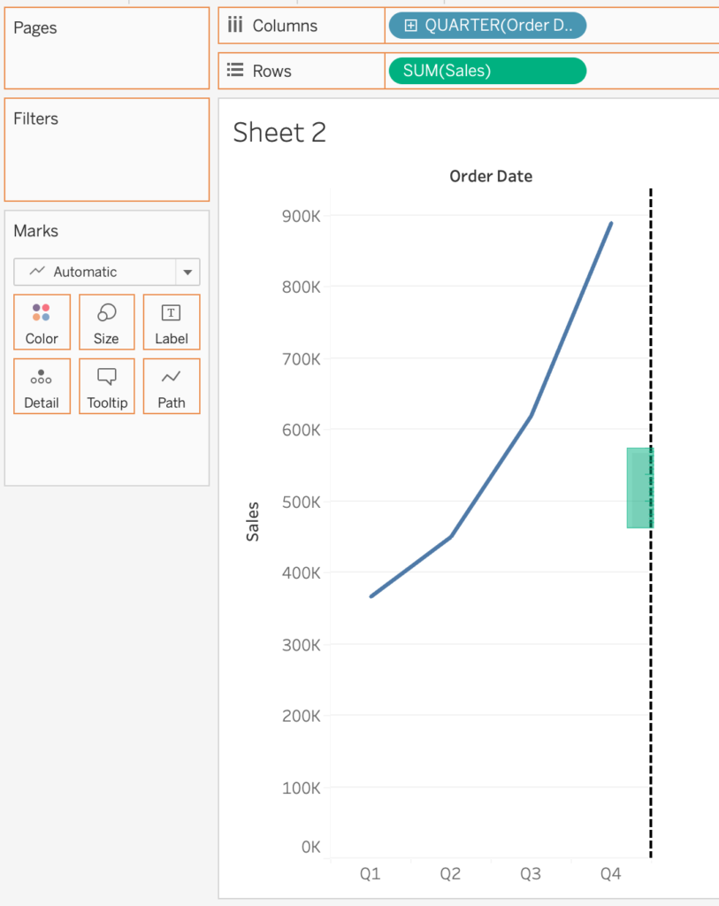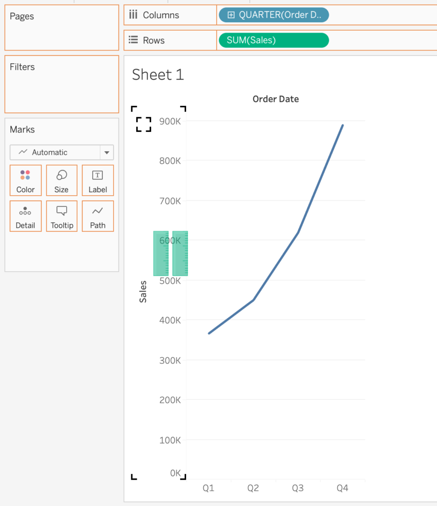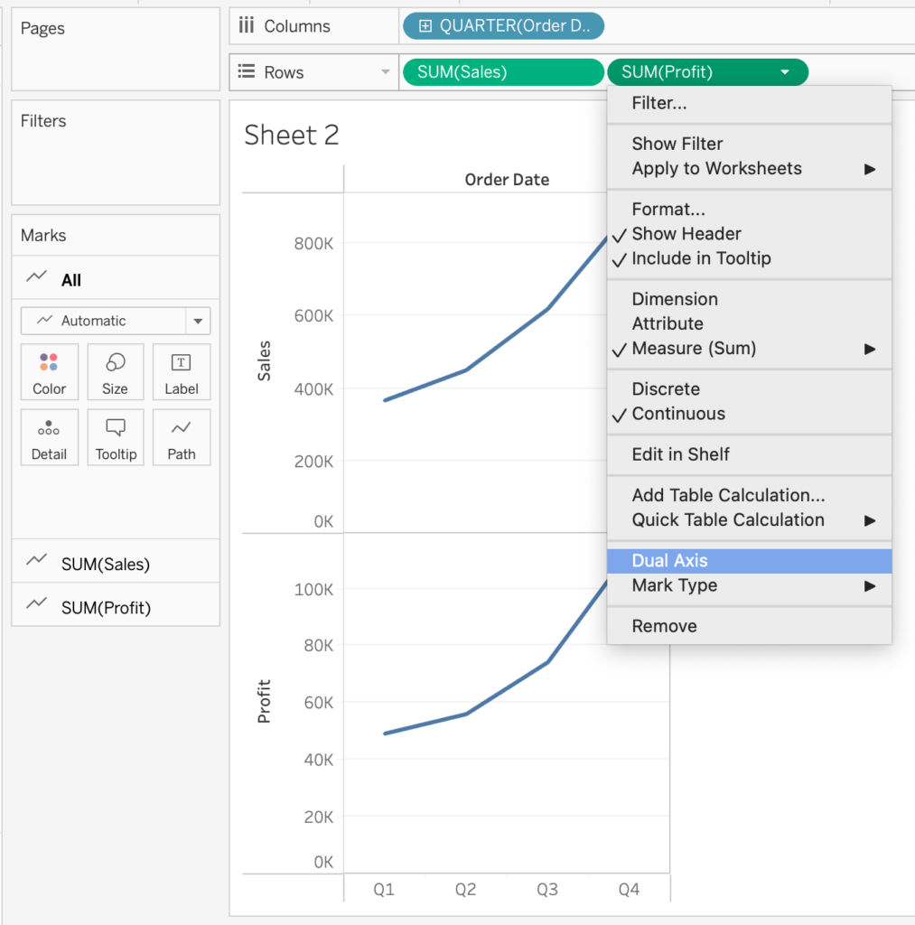 In order to change a basic chart to a shared axis chart, you would drag the second measure or dimension on the existing axis until two green lines appear. In the example below, I added the measure Profit to the already existing Sales by Quarter chart.