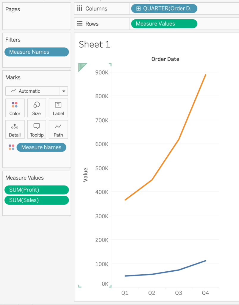 Notice that Tableau added many elements to the canvas; Measure Values has been added to the Rows shelf, as well as Measure Names in the Marks card. This is because Tableau automatically wants to differentiate between the two measures with different colours, as they exist on the same axis.