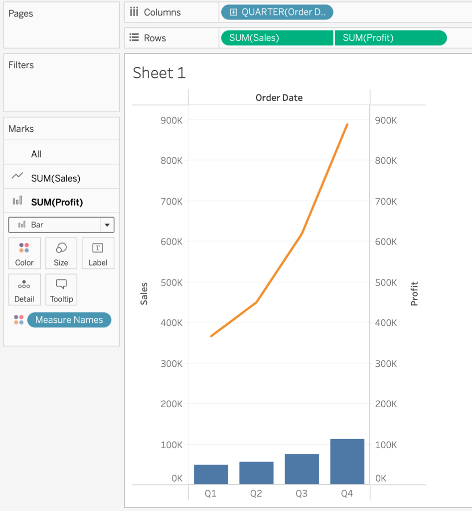 When the dual axis has been created, notice how a marks card is created for each axis. The advantage of this is that you don’t have to use the same type of chart for both measures (opposed to a shared axis chart): one measure can be a bar chart and one measure can be a line chart.