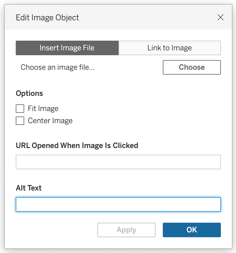 To add Alt Text for an image in Tableau, simply navigate to the options of the object (shown above) and enter your Alt Text.