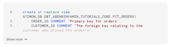 Run dbt and observe that the created relation and columns are annotated with your descriptions. We can see the comments added to the created view fct_orders on snowflake.
