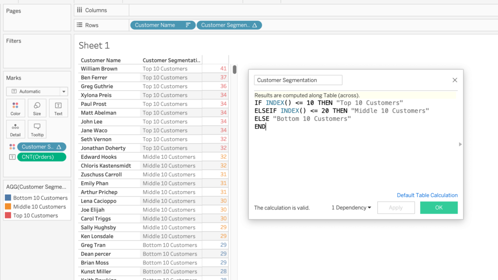 INDEX()function to assign an index number to each customer. - Create a calculated field to define the segments based on the index value. For instance, you might want to group customers into three segments: Top 10, Middle 10, and Bottom 10.