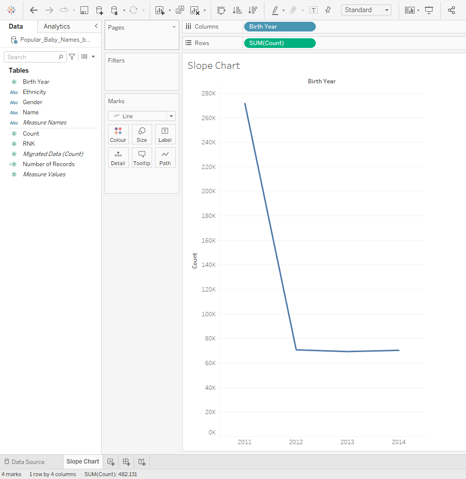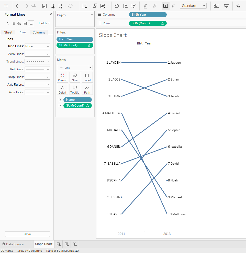 Dit zijn zo'n beetje alle stappen die je moet nemen om een hellingsgrafiek te maken in Tableau. De stappen hierna omvatten echter het opschonen van de weergave, wat volgens mij ook heel belangrijk is.