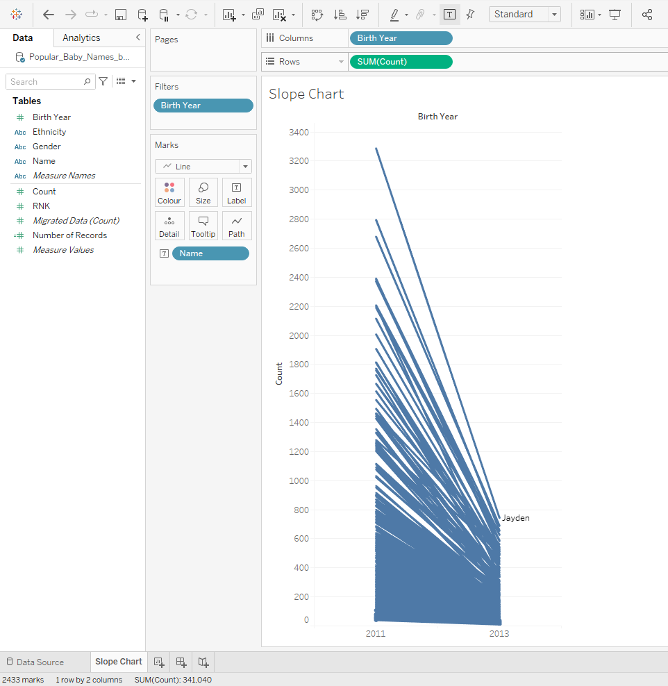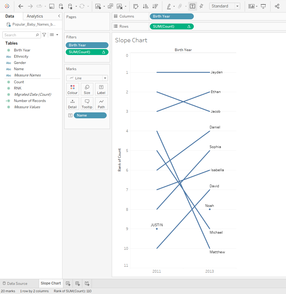 Om een hellingsgrafiek te maken, moet je ervoor zorgen dat je twee verschillende instanties hebt waarmee je je gegevens kunt vergelijken, zoals een tijdsinterval, landen of in feite twee verschillende categorieën. In dit voorbeeld zal ik twee verschillende jaren gebruiken om de populairste namen in de Verenigde Staten te vergelijken.