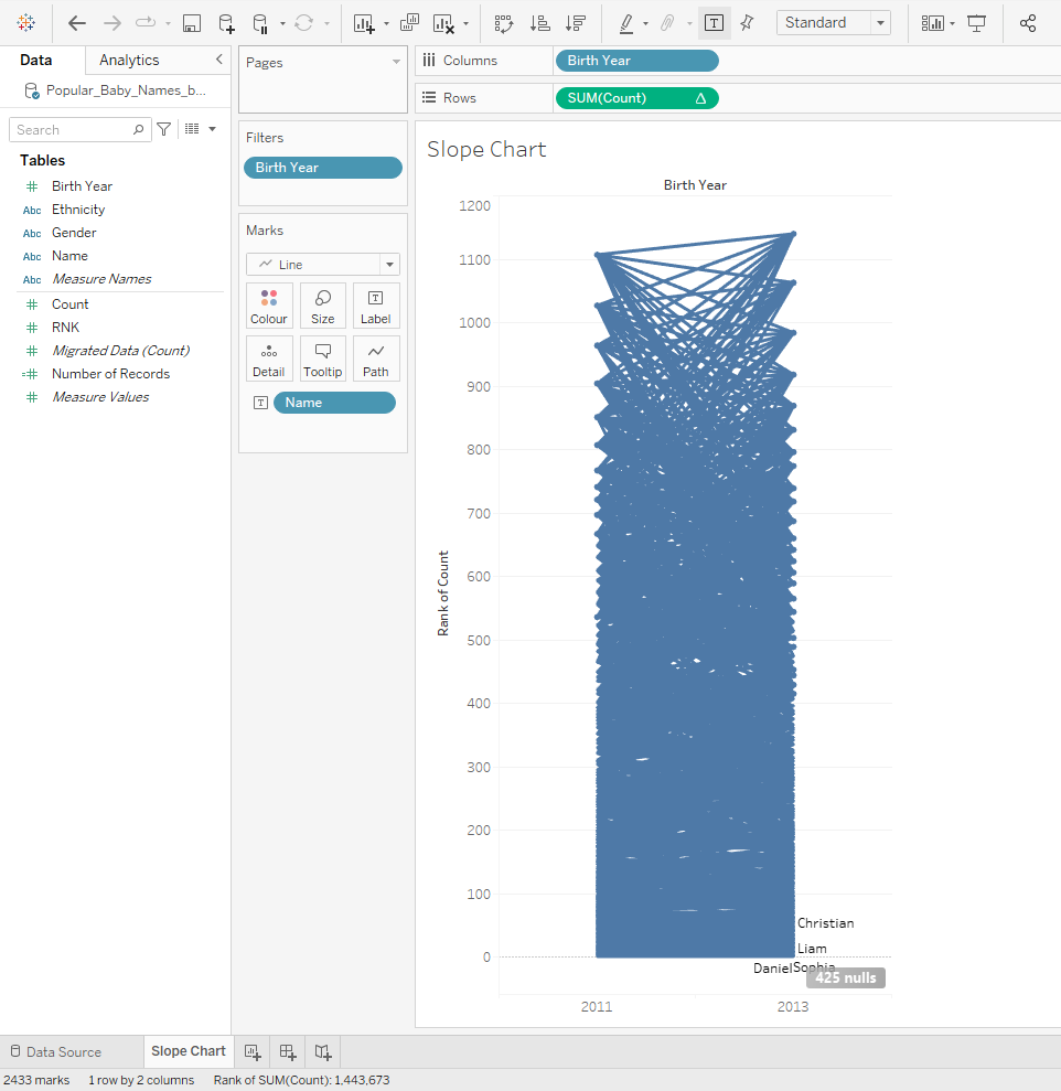 Deze grafiek ziet er echter erg onoverzichtelijk uit. Het zou het beste zijn om de namen te filteren. Voor de volgende stap zal ik een filter toevoegen aan "SUM(Count)" dat gaat van 1 tot 10. Op die manier kan ik de top 10 zien. Op die manier kan ik de top 10 zien van de namen die in 2011 en 2013 zijn gebruikt: