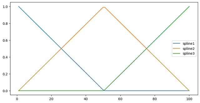 Laten we in plaats daarvan een voorbeeld bekijken. De beginwaarden van x (in ons voorbeeld hierboven) variëren van 1-100. We zullen deze enkele lijst van x transformeren. We zullen deze enkele lijst van x-waarden omzetten in 3 afzonderlijke lijsten van 100 waarden met behulp van een spline-functie. De resulterende waarden liggen allemaal tussen 0 en 1. We kunnen onze splines plotten op onze oorspronkelijke x-as;