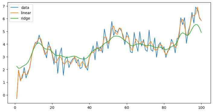 Benadering 3 maakt gebruik van regularisatie, die de complexiteit van het model beperkt door een straf te introduceren. De grafiek hieronder is van dezelfde gegevens, maar met meer ruis. Met behulp van splines met 50 knopen passen we twee modellen, een standaard lineaire regressie en een nokregressie. Het nokmodel maakt overfitting minder waarschijnlijk.