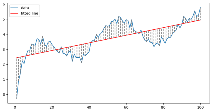 In het onderstaande voorbeeld hebben we een lijn gepast op onze gegevens (met wat toegevoegde ruis).