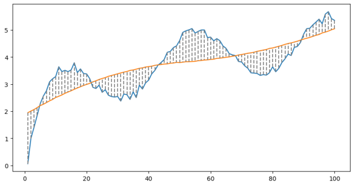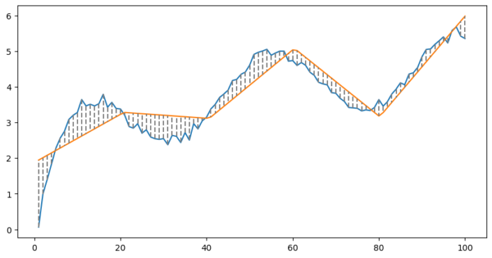 Het is duidelijk dat we onze gegevens beginnen te kloppen. Wat er gebeurt, is dat we onze gegevens opdelen in brokken en voor elke brok een aparte lijn passen.