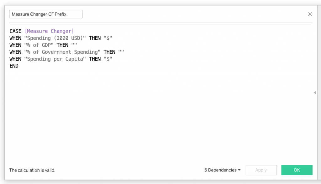 Wat ik wil doen is "Totale bestedingen" en "Bestedingen per hoofd" in miljarden weergeven en de percentagevelden weergeven met een procentpictogram. Daarom moet ik, naast het berekende veld dat ik heb gemaakt, ook twee extra berekende velden maken voor een prefix en een suffix. Mijn eerste berekende veld met de CASE-instructie ziet er als volgt uit: