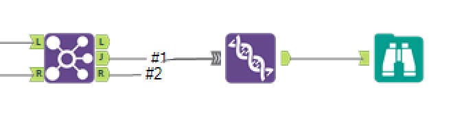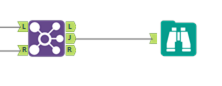 Zoals je kunt zien, heeft de union tool twee inkomende verbindingen van zowel het "L" als het "J anker". De union tool kan meerdere verbindingen hebben die binnenkomen. Het houdt zich bezig met het combineren van twee of meer tabellen met vergelijkbare structuren op basis van veldnamen of posities. Zoals je kunt raden, lijkt het uitvoeren van een right join en een full outer join erg op deze configuratie. Alleen de verbindingen worden gewijzigd. Hieronder zie je de configuratie voor een right join en een full outer join.