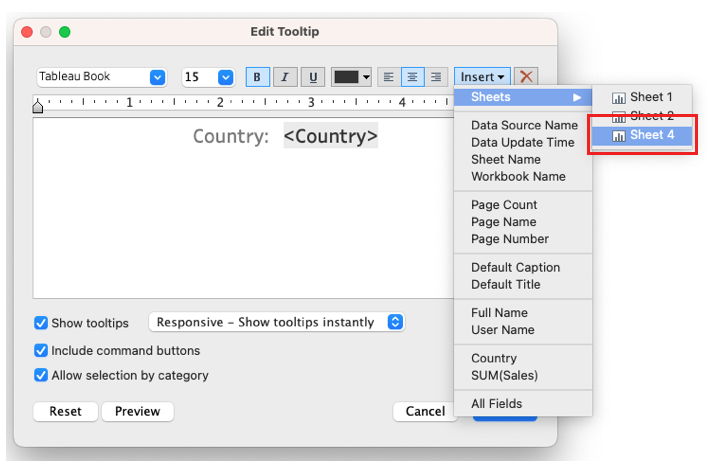 Another fun way of using a custom shape is within a tooltip. For this, you would have to add all the shapes in a new sheet. For example, in the sheet below (Sheet 4) I displayed all the shapes from my Country Flags shape palette. When you want to add them in a tooltip of a visualisation, simply add the sheet in the tooltip from the Insert context menu. You can change the sizing of the custom shapes in the sheet itself if they don’t fit into the tooltip.