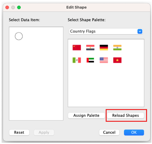 From here, after you’ve selected your palette, you can assign each shape to a specific category. Since I am working with country flags, I have reassigned each country in my visualisation to a custom flag shape.