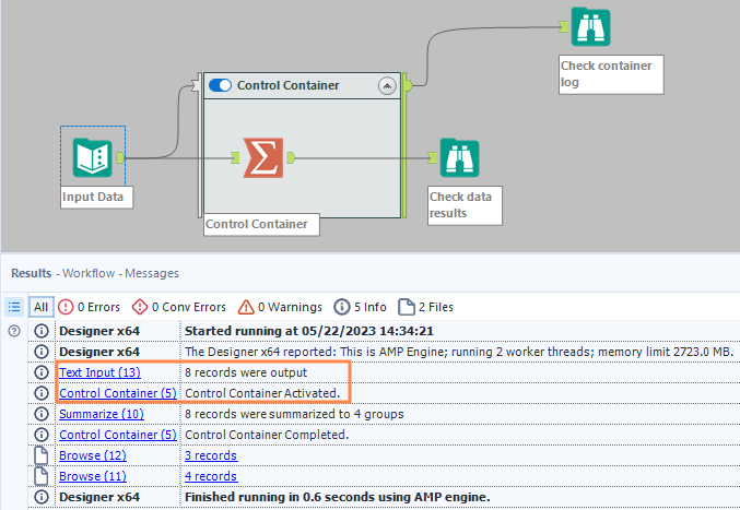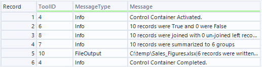 A Control Container outputs all user facing log messages of the tools it contains. This means messages, warnings, conversion errors and errors, together with the activation and completion messages of the Control Container itself.