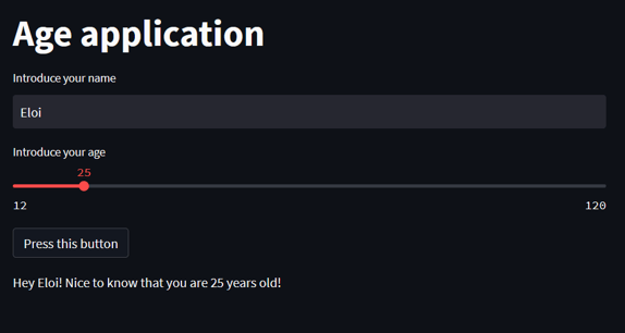 age = st.slider('Introduce your age', min_value=12, max_value=120)