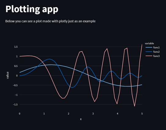 Of course, being in the data field, we are mainly interested on visualizing data. Streamlit offers native support for several plotting libraries like matplotlib. However, even though matplotlib can create impressive plots for publication and prints, we would like to create something a little bit more interactive, which matplotlib does not handle really well. Instead, let's use plotly!