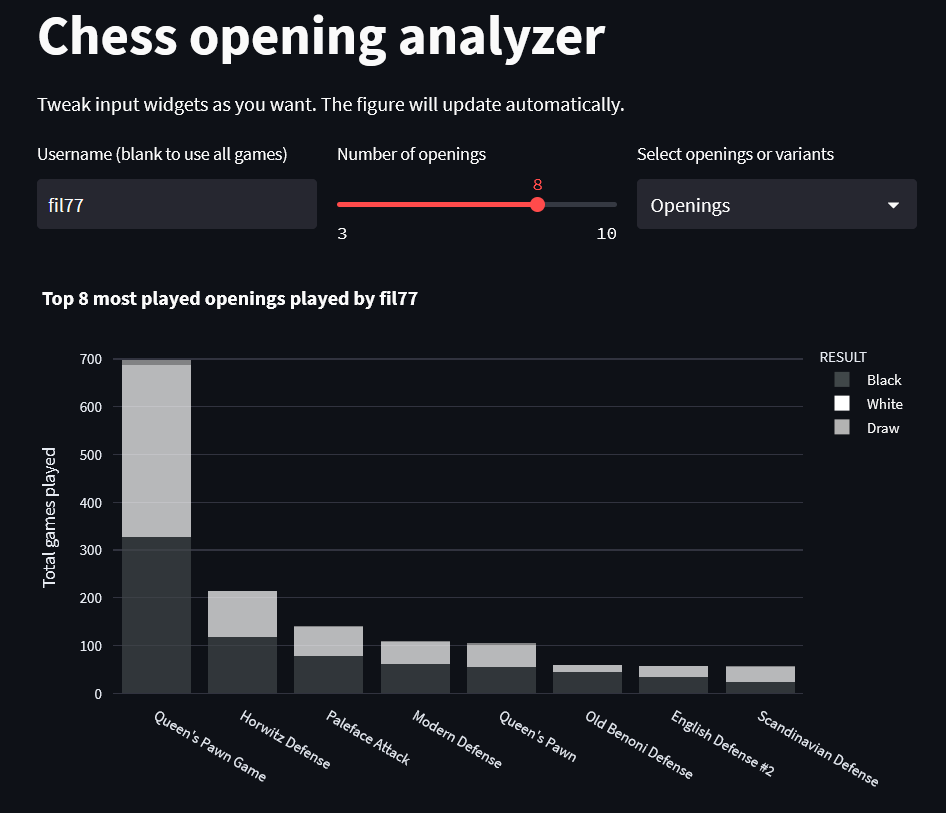 The user can use all games on the dataset or focus on just one user, choose the number of openings that are displayed and whether to use openings or variants. And that is only as user input!