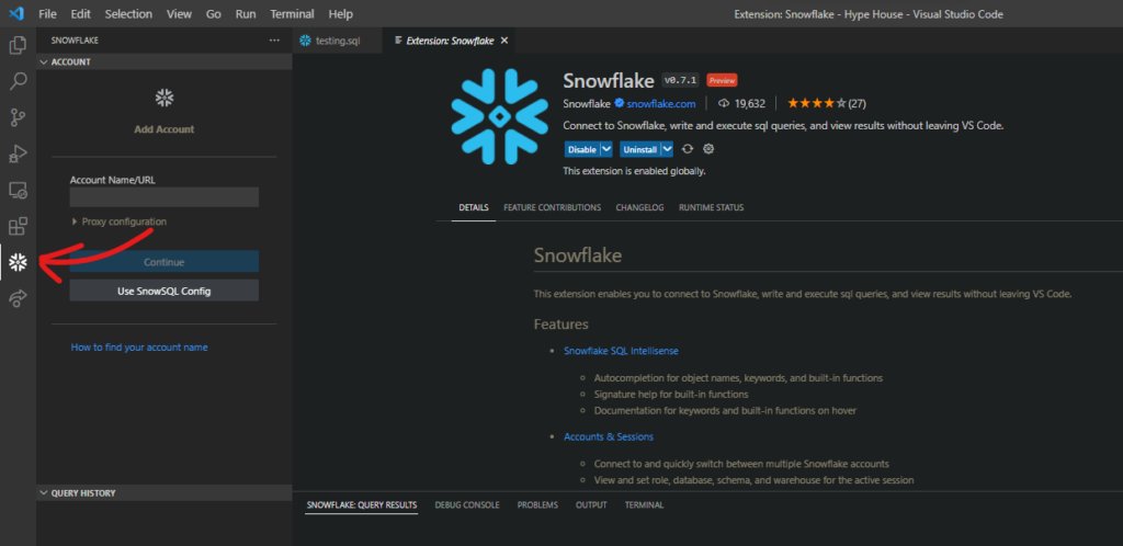 Once you have installed it, a new tab will appear with the Snowflake logo on the left side. You can click on it and the login section will appear.