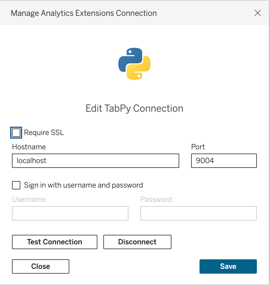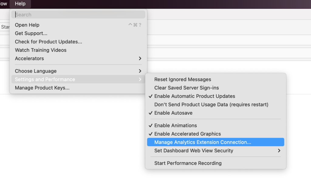 The web service is listening on port 9004 by default. Therefore the next step is to connect Tabpy to Tableau. Upon Launching Tableau Desktop, head over to Help > Settings and Performance > Manage Analytics Extension and Connection