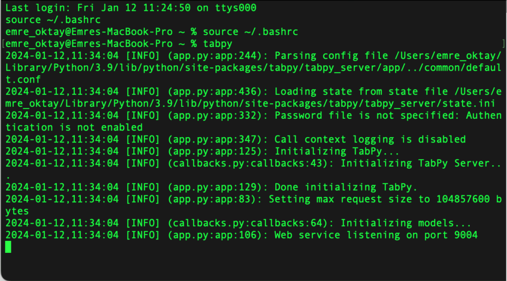So first things first is to install Tabpy, please follow the link provided in the introduction if you don’t have it installed on your machine (or server). Once it is installed, it needs to be running. So go to your terminal and type in tabpy to launch it.