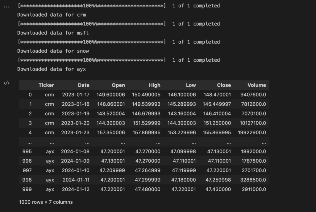 Once we run this code, we should see a dataframe with the stock information of Salesforce, Snowflake, Microsoft, and Alteryx for the past 52 weeks.