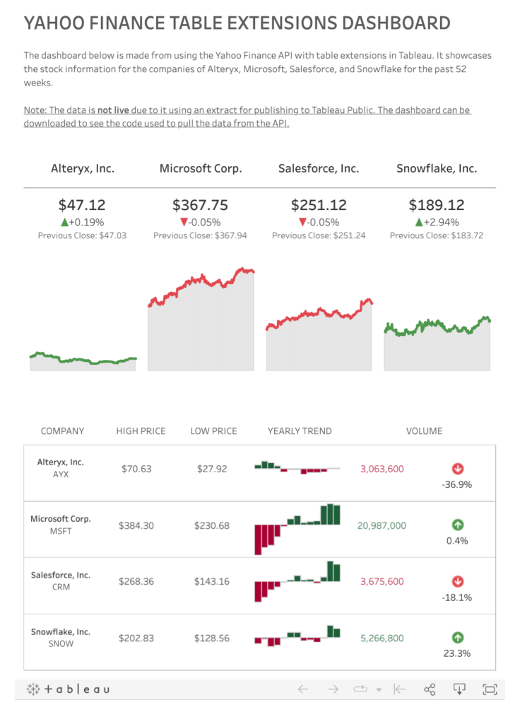 In this how-to guide, we will be going through how to use the Yahoo Finance API directly from Tableau without the use of a database to store the data. This unusual method makes use of the analytic extension called Tabpy and table extensions. Therefore, we will not only be using Tableau for this one but a little bit of Python as well.