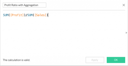 In the profit to sales ratio example, the calculation can be written in two ways that will result in completely different results. The first one is with a SUM wrapped around each field as follows: