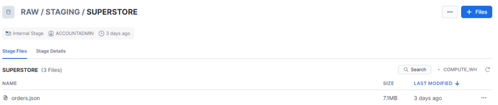 Let's get to the practice. Consider the Internal Stage SUPERSTORE, containing the file orders.json:
