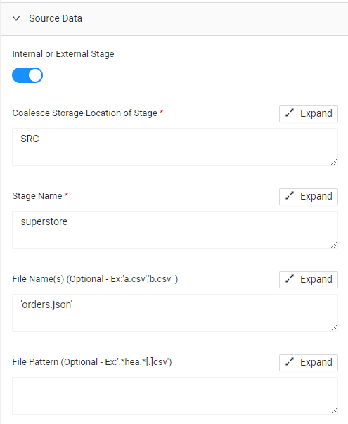 - Under Source data, toggle on "Internal or External Stage", fill in the fields with the correct Storage Location (SRC), the Stage Name (superstore), and the File name surrounded by single quotation marks ('orders.json').