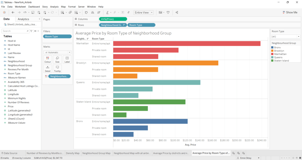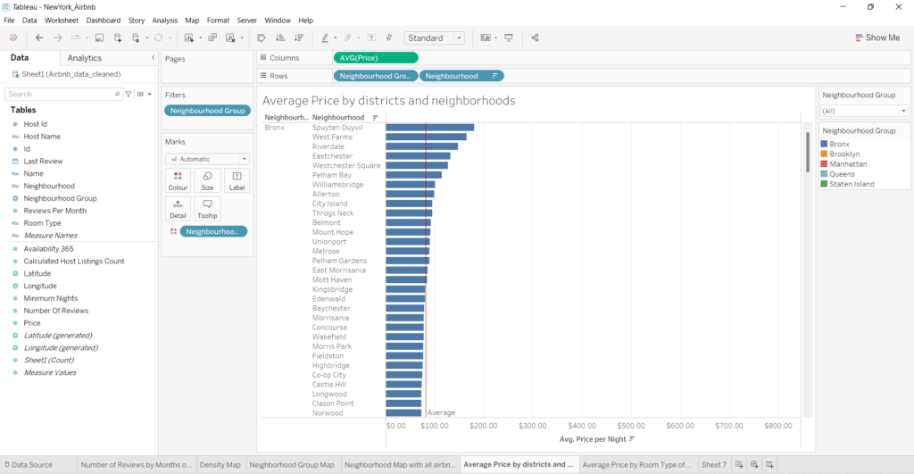 I have filtered and color coded the boroughs in this sheet as well so it matches the colors of the Borough Map. The filter allows the user to select desired borough or all. In addition, I have also added an Average Line for each borough so that comparing average prices of specific neighborhoods with the average price per borough is easier.