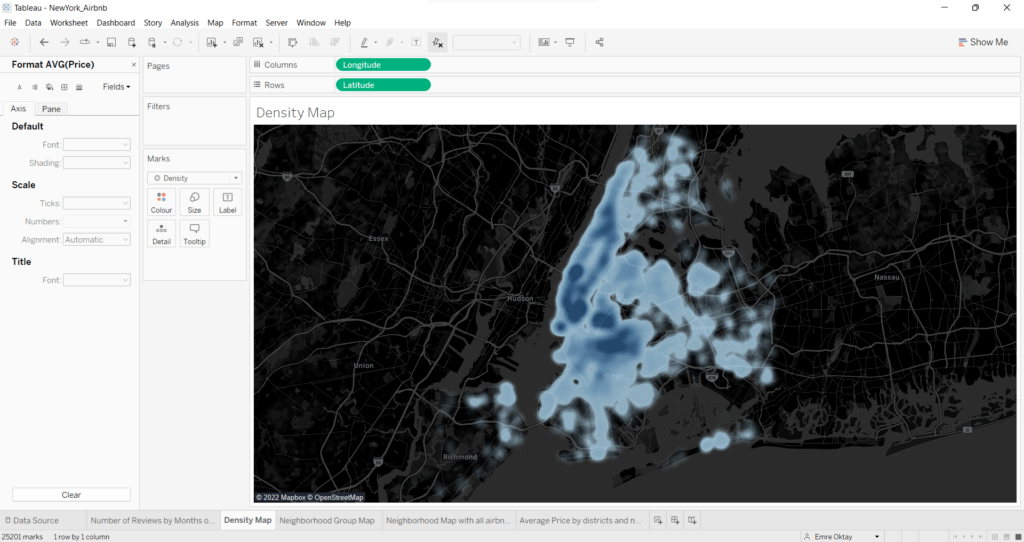 For this I used a different map background of “Streets“. The Borough Map includes five distinct values therefore I can use color to categorize. Another important point is that the boroughs need to be assigned a geographical role. This way, Tableau can automatically draw shapes based on the borders of the five neighborhood groups of New York. The latitude and longitude data used in the view is generated from assigning the geographical role of the “Neighborhood Group” field.