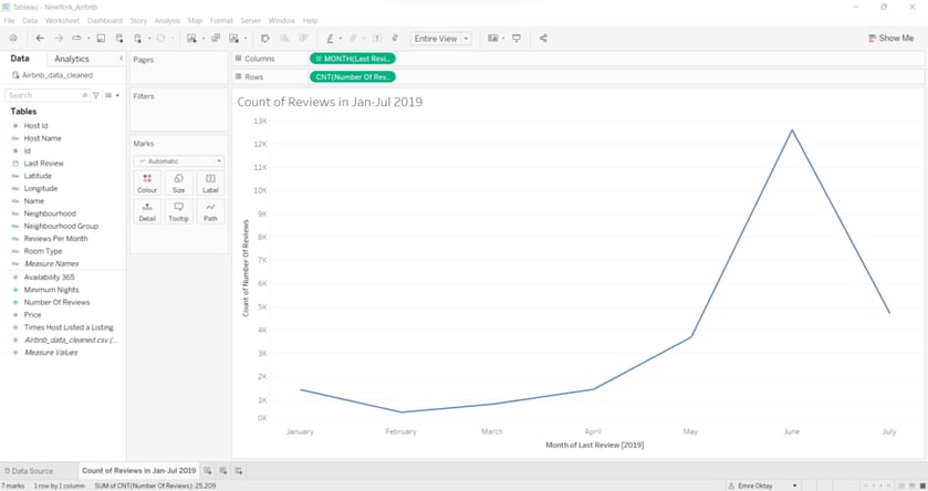 As it can be observed, there is a sharp increase in reviews from May (~3000) to June (~12000) with a sharp decrease by July (~4700). This can be due to the summer season coming up in the year and the influx of tourists staying in New York through the summer. Since the dataset ends on July, we cannot see how the trend is for the end of the year.