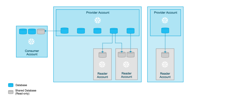 - Databases: A reader account doesn’t have data by default. To access shared data, create databases for each shared resource.